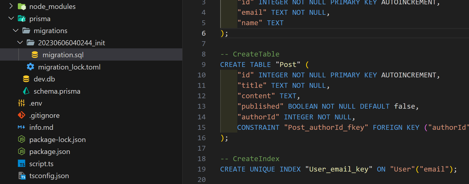 그러면 prisma/migrations 폴더가 생성되고, 최종적으로 새로운 migration.sql 이 생성됩니다. 이것에 근거하여 쿼리를보내려면, script.ts 파일이 필요 합니다.