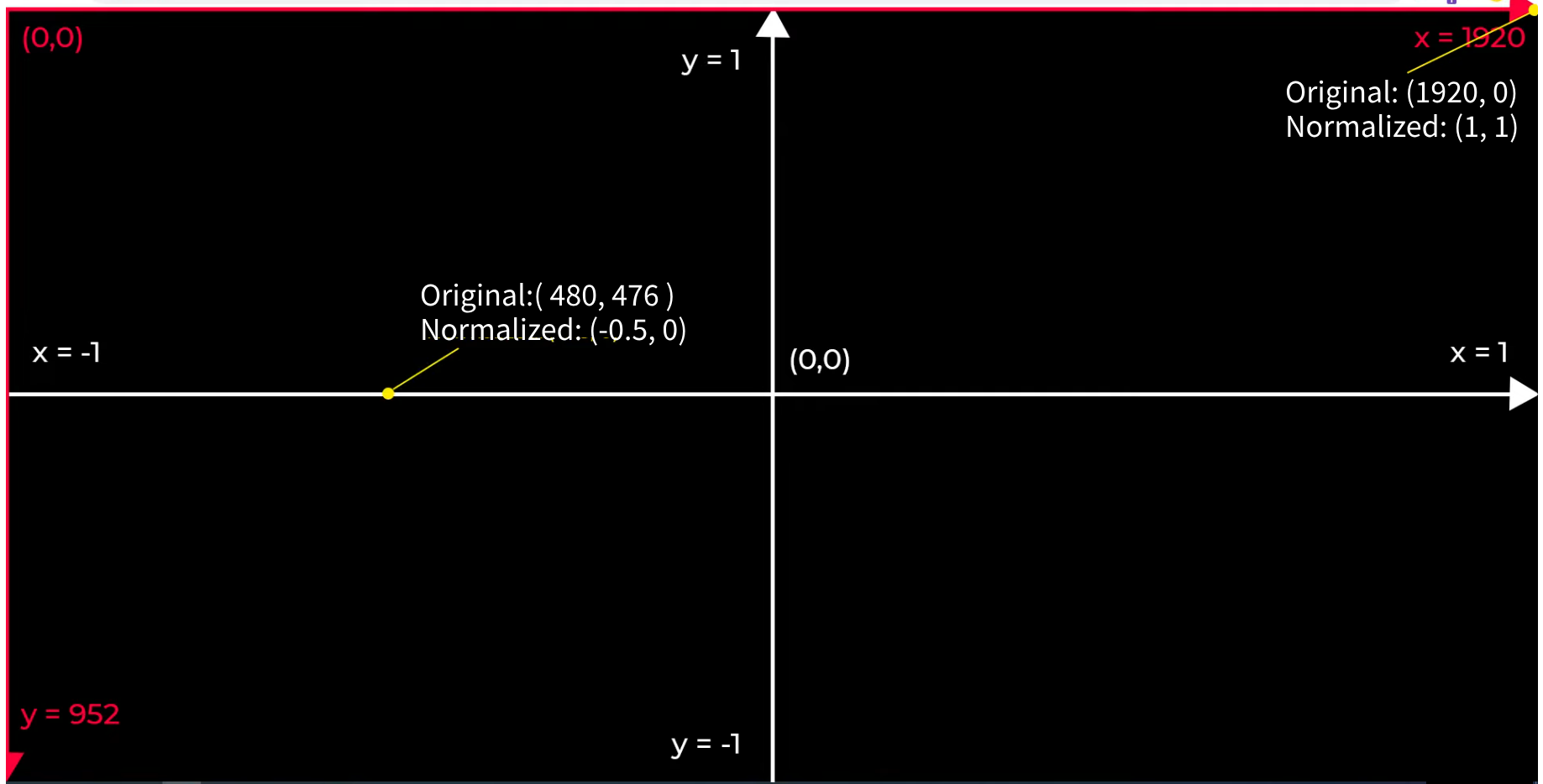 mousePositionY : - ( 476 / 952 ) * 2 + 1 = -0.5 * 2 + 1 = -1 + 1 = 0