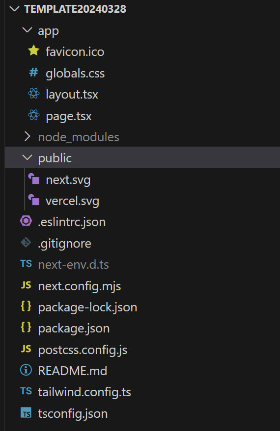 현재 버전은 Next.js 14.1.4 이며, 초기 설치시 디폴트 폴더구조와 설치과정입니다.